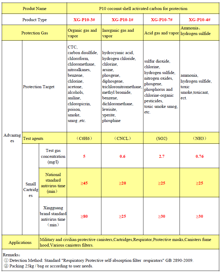 P10 coconut shell activated carbon for protection