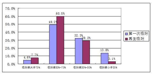 抽檢報(bào)告顯示,第一次試驗(yàn)后35批次樣品的甲醛吸附效率大于50%,可認(rèn)定為吸附效率較高;而經(jīng)過再生后,較高吸附率產(chǎn)品占67.7%,數(shù)量明顯增加。宋紅波工程師表示,這表明暴曬可以使使用過的活性炭達(dá)到再生的目的。